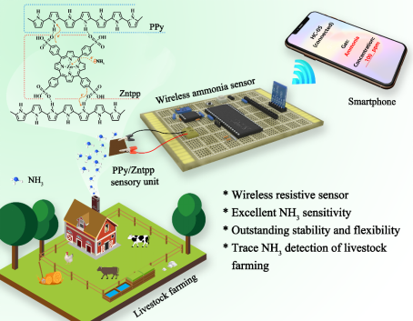 畜牧业对环境氨含量监测的需求日益增加,氨监测可以防止畜产品受到细菌和病毒的污染。聚吡咯(PPy)是一种很有前途的电阻传感器材料,但其灵敏度低,选择性差。本文通过一步电化学沉积的方法,将锌-四(对磺酰基苯基)卟啉(Zntpp)颗粒固定在PPy上,形成具有皱纹状纳米结构的电阻传感器。测试结果表明,PPy/Zntpp (Pzt)传感器对氨的响应值为104.3%,响应恢复时间为42/223 s,而PPy传感器的响应值为7.2%,响应恢复时间为47/230 s,最低检测限为~8.63 ppm,可用于畜牧业中痕量氨的检测,其氨敏机理可归因于p-n异质结机制。此外,还组装了由Pzt传感元件、微型计算机和蓝牙模块组成的无线传感装置,通过智能手机可以实时精确读取浓度信息,在畜牧养殖领域具有广阔的应用前景。