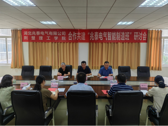 8月25日下午,荆楚理工学院与湖北兆泰电气有限公司合作共建“兆泰电气智能制造班”研讨会在我院如期举行。湖北兆泰电气有限公司董事长杜月彬、总工程师张义程、技术总监王维保,我院院长唐铸文、副院长杜华兵、教研办主任万行花、电力系统与电气控制教研室主任孙歆钰、电气工程及其自动化专业负责人喻剑平一起就合作共建“兆泰电气智能制造班”展开研讨。