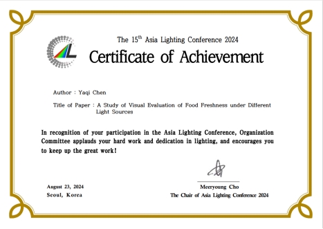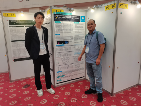 在会上,由印刷工程专业本科生陈雅琪同学撰写的研究论文“A Study of Visual Evaluation of Food Freshness under Different Light Sources”被大会论文集收录并在大会Poster Session环节交流。论文通过设计实验,研究了4种普通光源和3种生鲜灯照明条件下,消费者对食品新鲜度的判断及照明条件对购买意愿的影响。